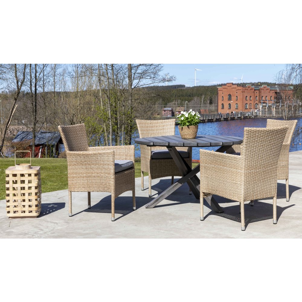 Vancouver matgrupp ger dig en utemöblegrupp i neutral naturfärgad konstrotting som passar in fint i trädgården. Möbelgruppen består av ett runt rejält matbord med 4 stycken matchande sköna fåtöljer med dynor.