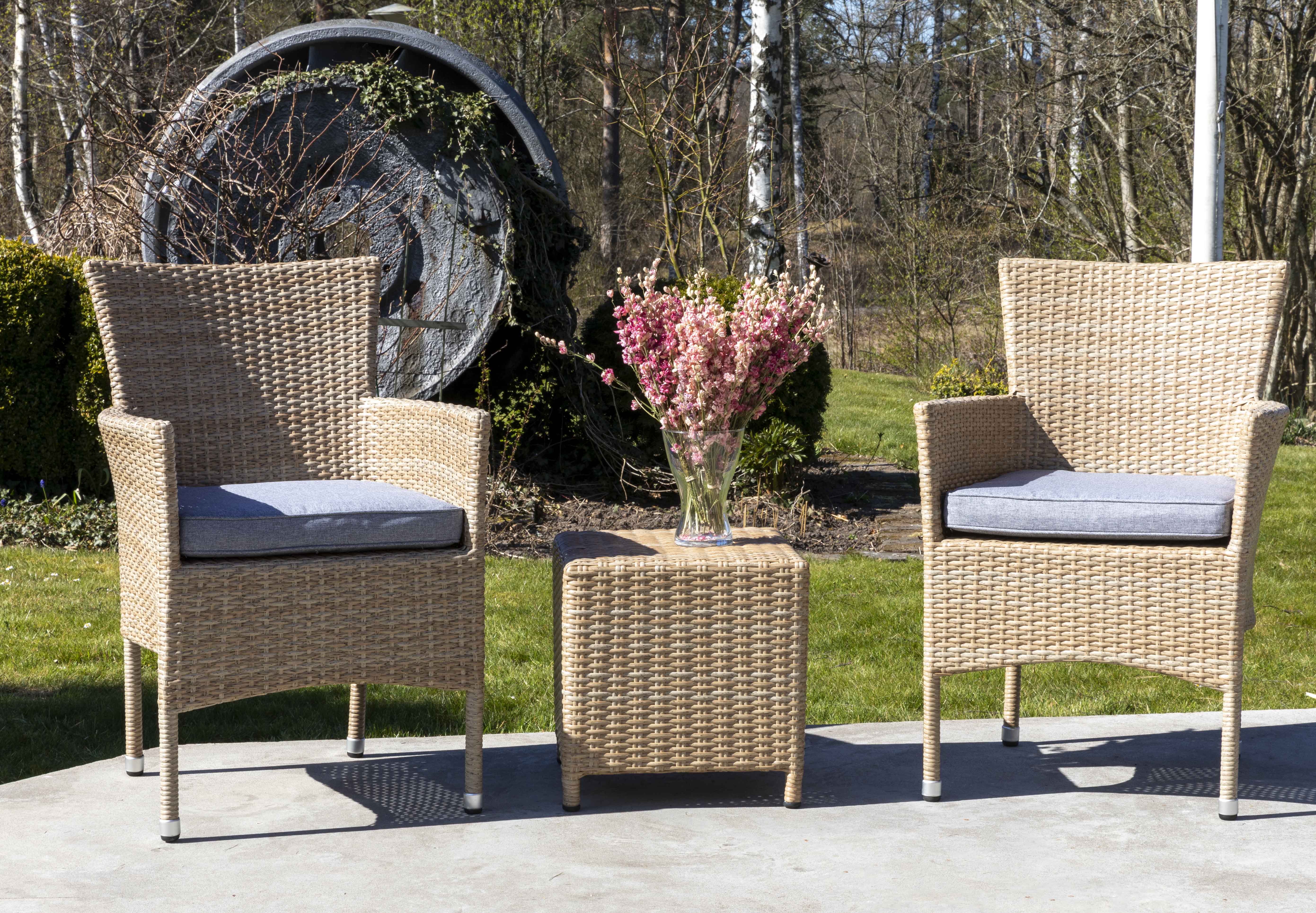 Fåtöljset Vancouver med två sköna fåtöljer med dynor och ett sidobord, allt i matchande naturfärgad konstrotting. Passar bra för avkoppling ute på balkongen, terrassen etc.