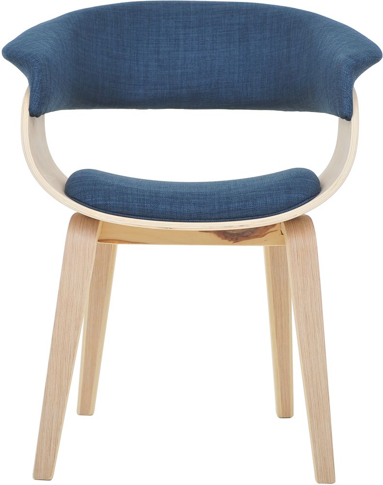 Fräck stol med blått tyg och stomme i vitpigmenterad och vaxlackad ek. Stolens sits är böjd i en halvcirkelform.