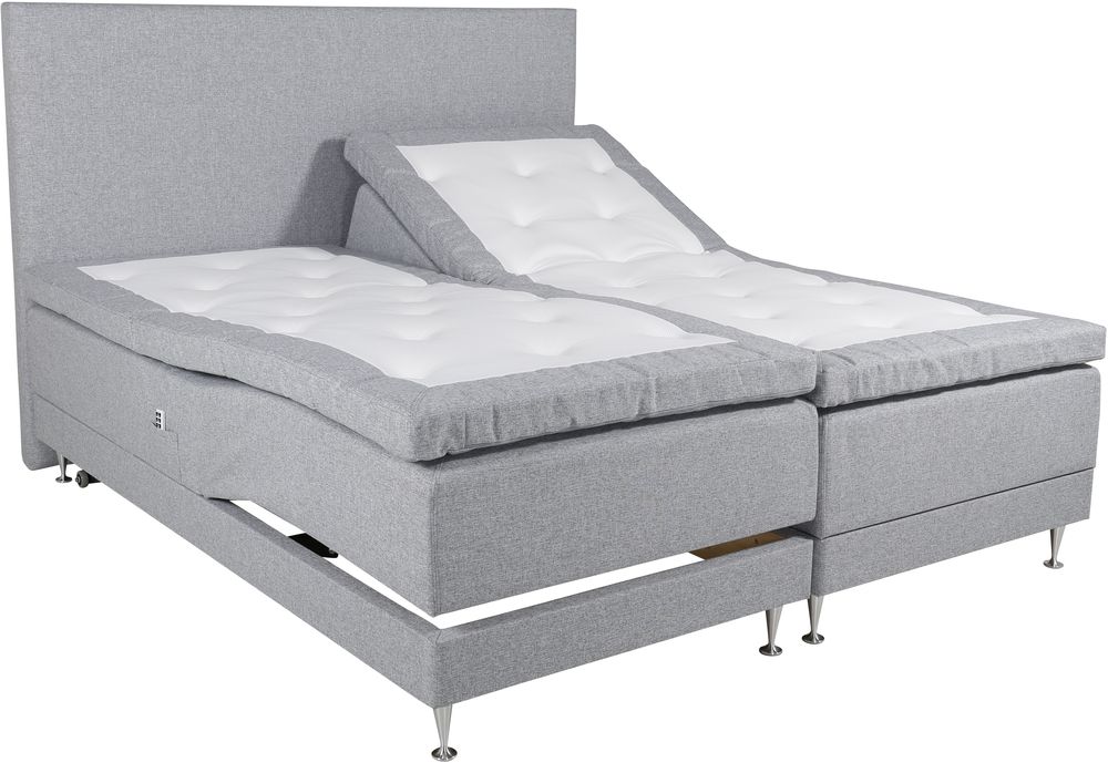Resårmadrassen kommer i 2x90 (180) cm och är uppbyggd av 15 cm höga pocketfjädrar med 5 komfortzoner som följer kroppens former samt stålkonstruktion med motor från Linak. Sängen är steglöst inställningsbar, i sitt- och liggställning, som styrs med hjälp av fjärrkontroll och erbjuder en god komfort. Den pikerade bäddmadrassen kommer i 2x90 (180) cm och är uppbyggd av mikrofibervadd och kallskum.Sammantaget är sängen uppbyggd för att ge en skön sovkomfort samt ge ett enhetligt intryck i sin helklädda design. Hela sängen vilar på 12 cm höga champangeben i silvrig aluminium.