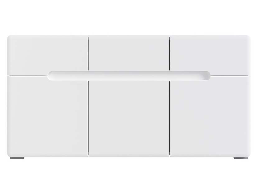 Robust sideboard med vit högglans fronter som sticker upp tillräckligt för att använda som handtag för skåpsdörrarna, samt har de en mjukstängande funktion. Mycket förvaringsmöjligheter och kan med fördel kombineras med andra möbler i samma serie.