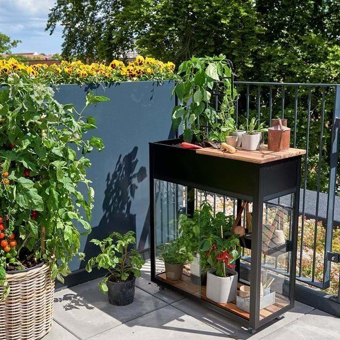 Nedre delen består av växthus med väggar och skjutpartier av 4 mm härdat glas. Den flyttbara hyllan gör att du enkelt kan ta med dig örter in i köket eller möbler växthuset på olika sätt. Svartlackerade aluminiumprofiler håller uppe ett arbetsbord i övre delen, där du kan plantera om växter eller nyttja utrymmet till krukväxter som tål att stå ute i friska luften. Inkuderat är ett par krokar att hänga verktyg på, en mindre spaljé att låta växter klättra i, alternativt hänga krukor med krok (ingår ej) och även en arbetsskiva.