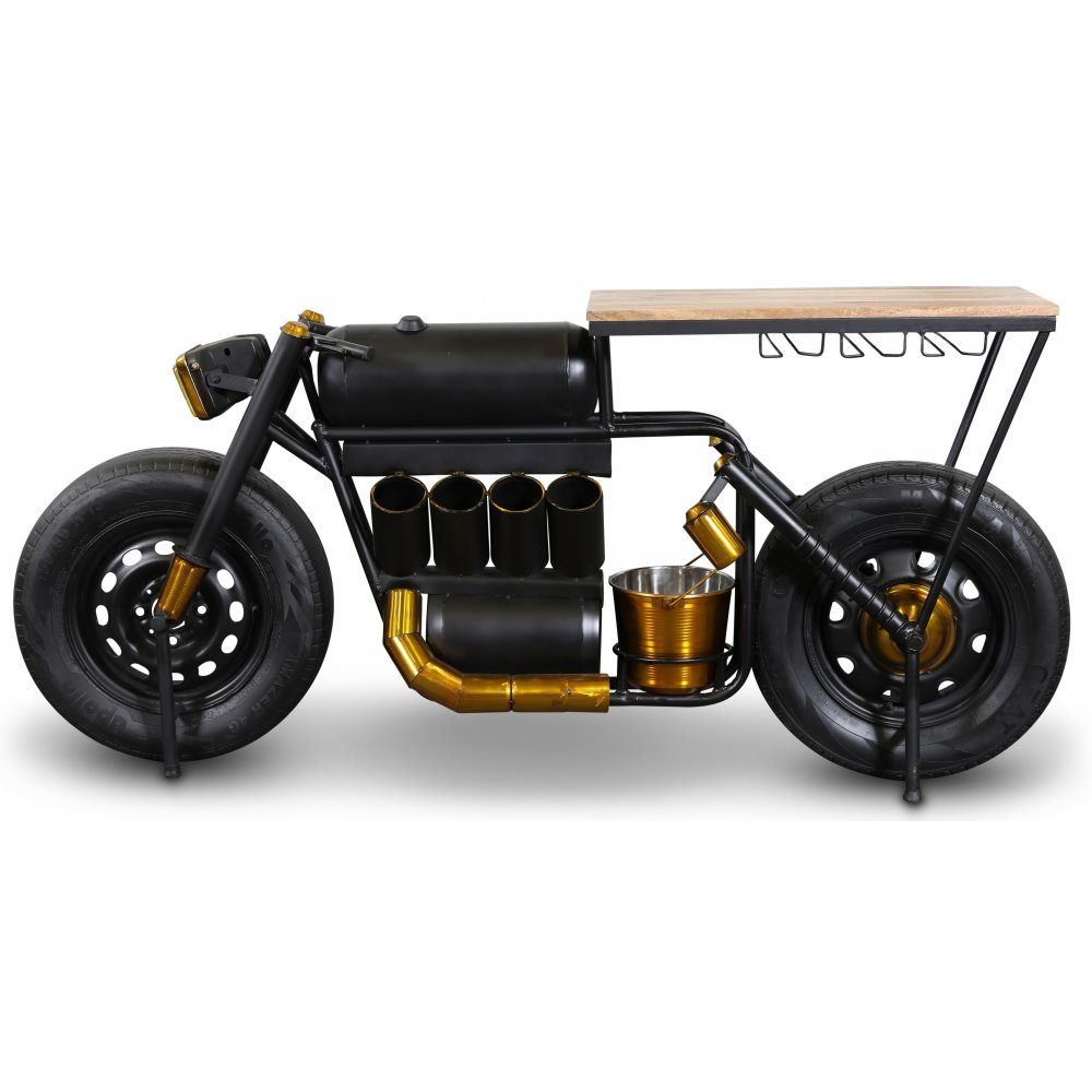 Bardisk bikermodell med plats för både flaskor och glas, även en kylhink. Stomme i svart metall med snygga kontraster till den guldiga färgen. Toppskiva av mangoträd.