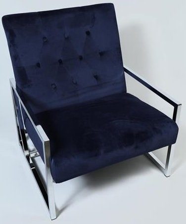 Stilren fåtölj i mörkblått sammetstyg med kromat underrede. Art deco stil.