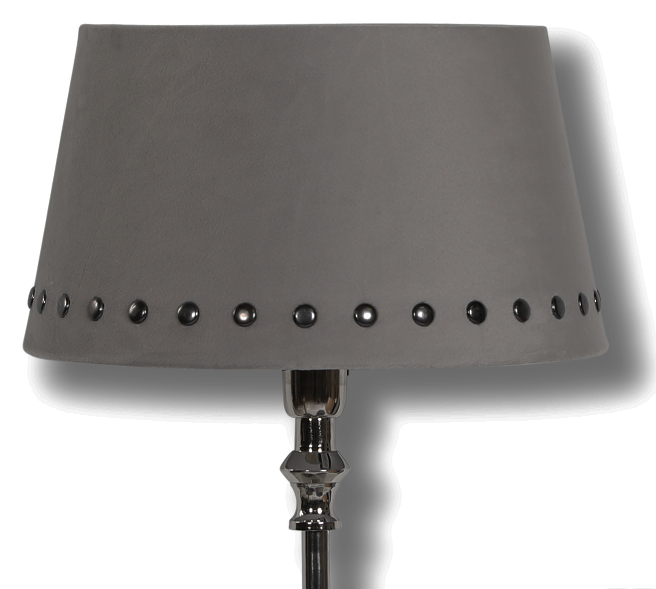 Velvet lampskärm i en exklusiv design med grått sammet och nitar i rökfärgat. Passar både E14 och E27 fattning.