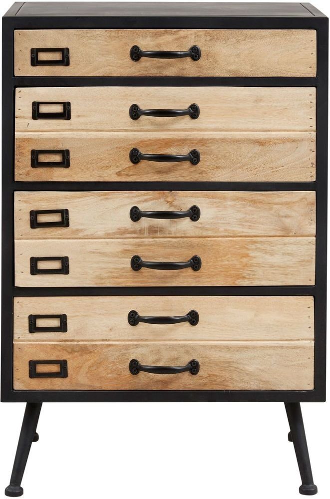 Stilren byrå med träfärgade fronter på lådor av mangoträd, övrigt i svart. Tre större lådor och en mindre ger gott om förvaring. Stomme av metall.