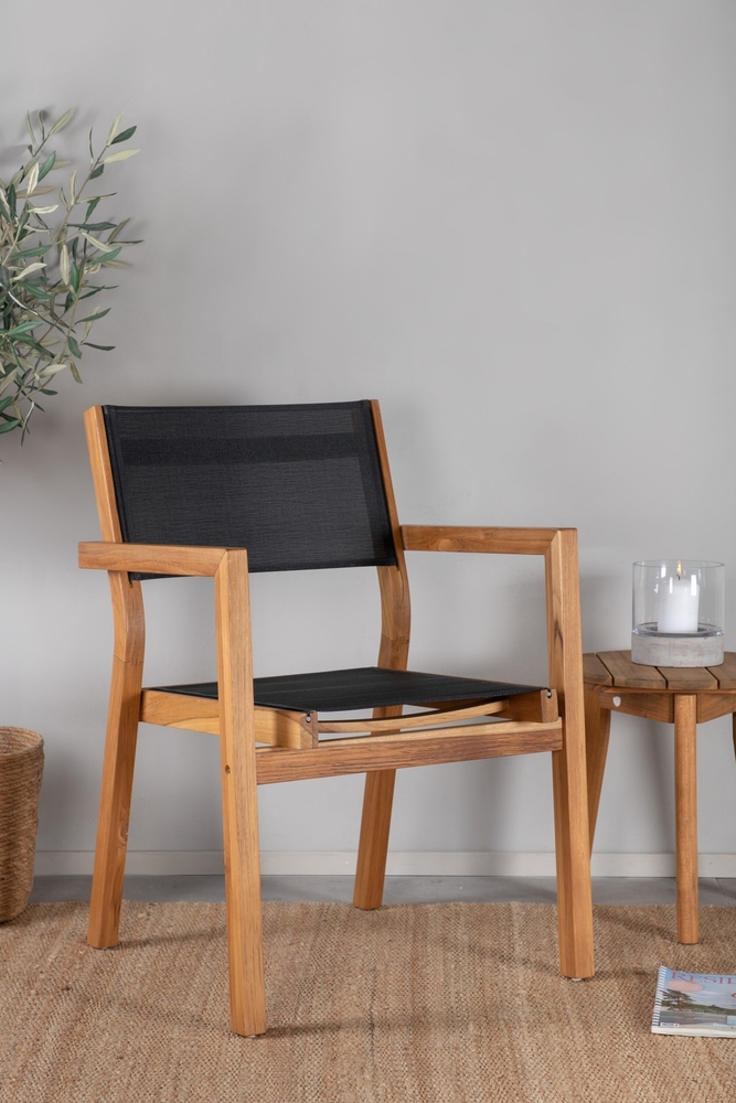 Att matcha svart och trä känns helt rätt! Tack vare sin stilrena och moderna karaktär blir denna stol från serien Venice någonting alldeles extra. Den slitstarka material-kombinationen av teak och textilene ger dig en tålig matstol för alla tillfällen. Matcha med ett läckert matbord och njut av somriga måltider. Skötselråd: Textilene är ett syntetiskt tyg som är tillverkat av PVC-behandlad polyester. Materialet är vattenresistent och UV-behandlat för att motverka solens blekning. Rengöring bör göras ungefär en gång i månaden, använd en fuktig trasa och torka av.