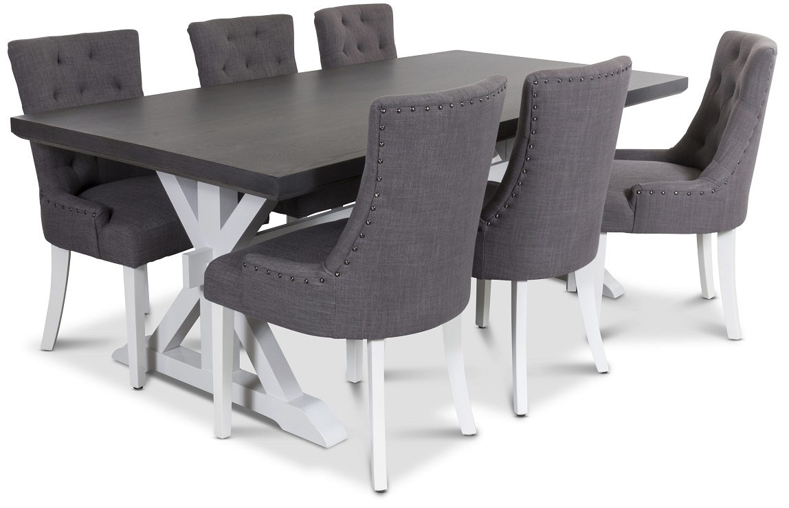 Medföljer gör också 6 st Tuva stolar i ett slitstarkt grått tyg med vitlackade ben, Stolen är en välarbetad och gedigen matstolar till Vintage-stilen!