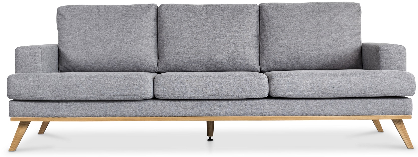 Modern soffa i ett mjukt och slitstarkt tyg, Malmö 90 ljusgrå, med massiva träben och trälist undersoffstommen i ekbets. Stoppning i sittdynor är 35kg Kallskum av högkvalite med fiber topp.