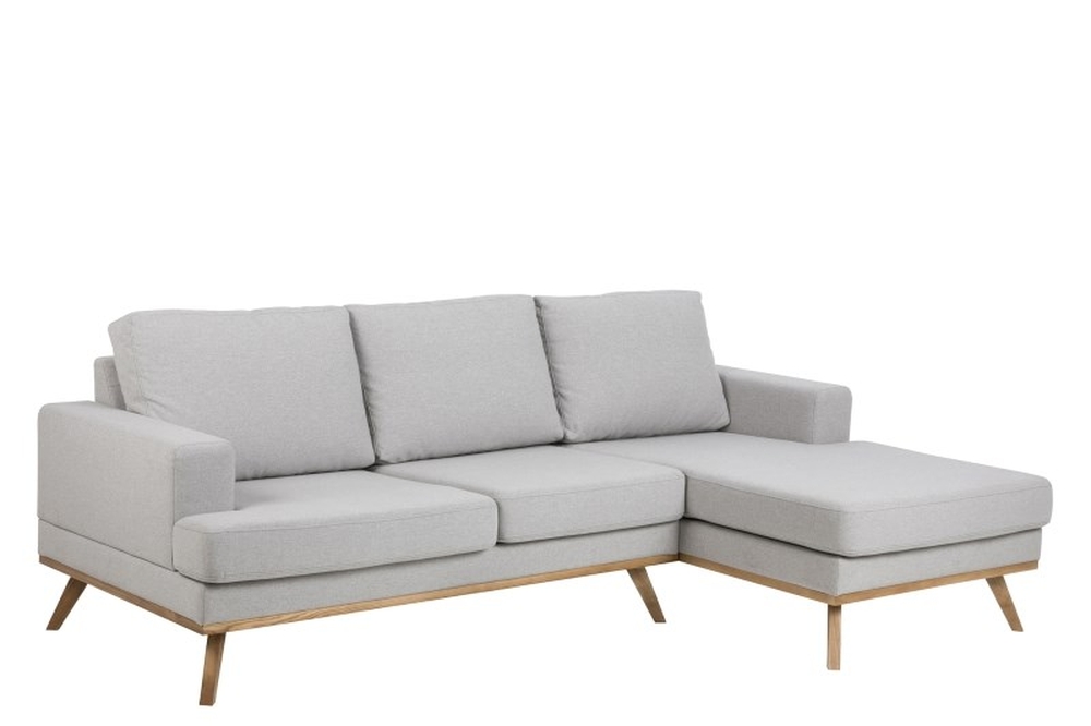 Modern och skön soffa, klädd med ett härligt ljusgrått tyg och snygga ben gjorda på lackbehandlad askträ. Schäslong på höger sida.