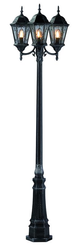 Utomhusbelysning Vera med en klassisk design. Tillverkad i grå lackerad metall med tre lamphuvuden av detaljerat glas. Markjärn för ingjutning medföljer. Stor lamphållare (E27). Max 75W glödljus eller motsvarande styrka i halogen, lågenergi eller LED. IP-klassen är IP23 avsedd för fast installation.