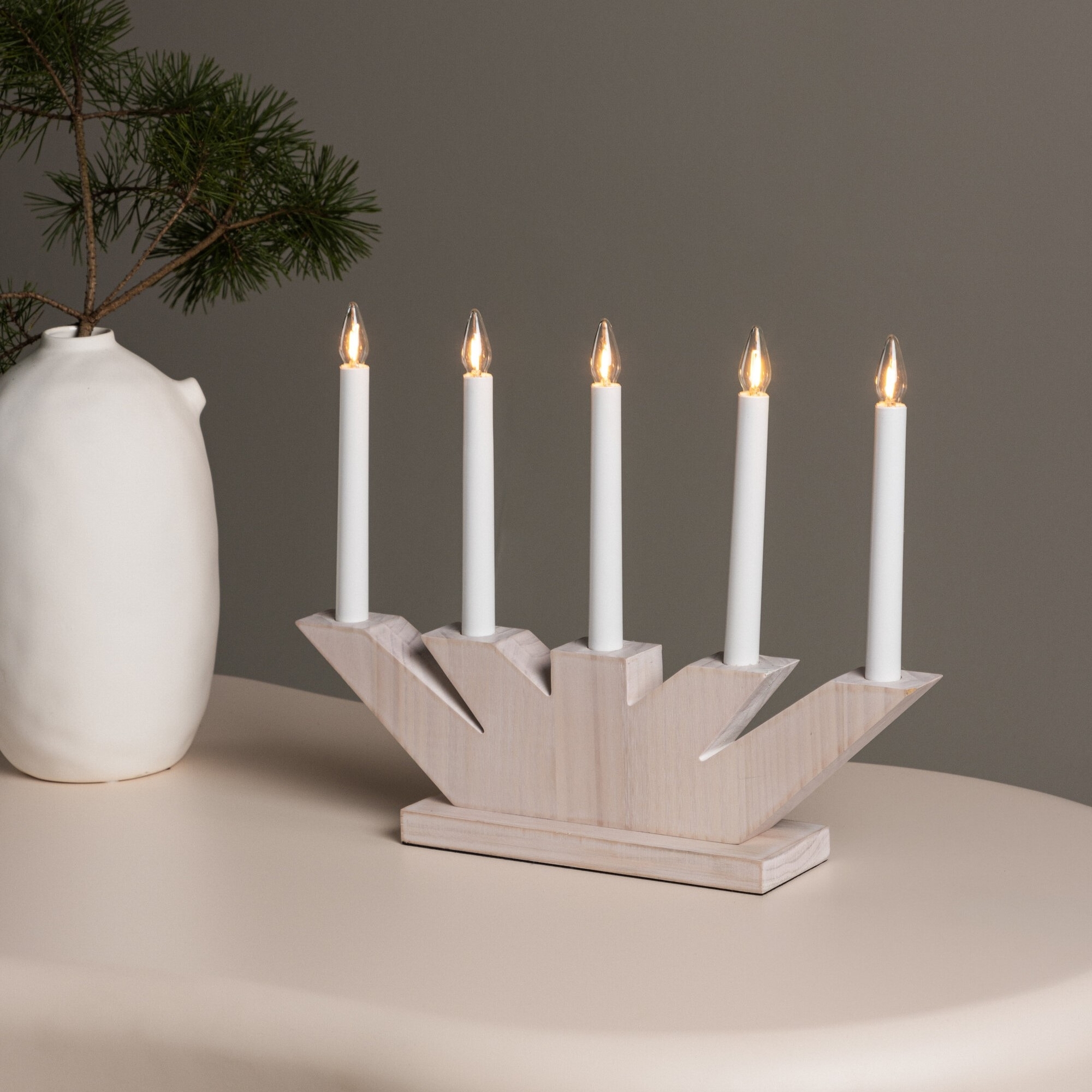 Ge ditt hem en touch av naturlig elegans med Verbier adventsljusstake. Denna vackra adventsljusstake är tillverkad i vitvättad tall och erbjuder en stilfull tolkning av den traditionella adventsdekorationen. Med fem inkluderade lampor sprider den en mjuk och inbjudande belysning som skapar en atmosfär av förväntan inför julen. Den vitvättade tallen ger en subtil och naturlig känsla till din inredning och skapar en lugnande atmosfär i ditt hem. Placera den på din matsalsbord, en hylla eller som en central del av din juldekoration för att lysa upp ditt hem under hela julperioden. Med Verbier adventsljusstake kan du skapa minnesvärda stunder och njuta av jultraditioner med en enkel och naturlig touch. Låt den bli en viktig del av din jul och skapa varaktiga minnen för kommande år.