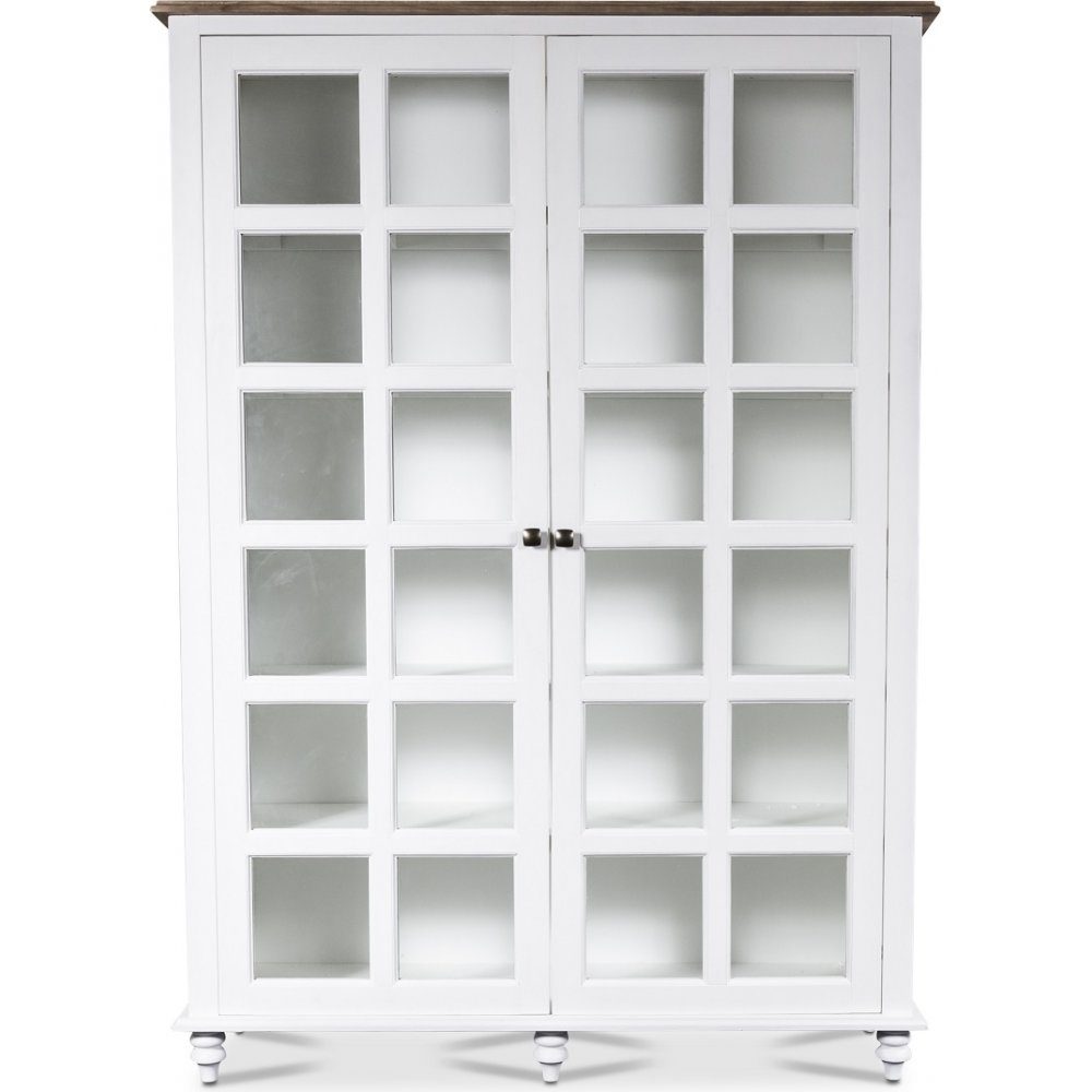 Victoria vitrinskåp med vitmålad stomme och en vaxad toppskiva i massivt återvunnet pinjeträ som är brunbetsat. Praktisk förvaring på hyllor innanför de två vitrindörrarna.