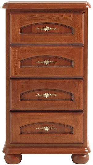 En praktiskt byrå i valnöt- och kastanjeimitation. Byrån har fyra lådor vilket gör det mycket rymligt. Med sina rundande former och mässingshandtag blir möbeln ett klassisk inredningsdetalj i ditt hem.