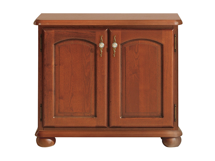 Ett praktiskt sideboard i valnöt- och kastanjeimitation. Sideboardet har två dörrar och en bra avställningsyta upptill. Med sina rundande former och mässingshandtag blir möbeln ett klassisk inredningsdetalj i ditt hem.