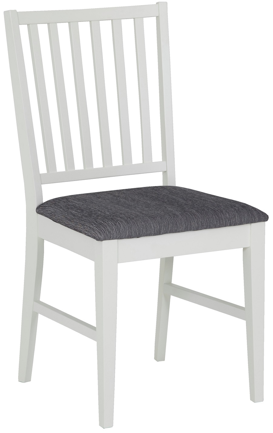 Vienna matstol i massivt heveaträ, helt vit i klassiskt utförande. Kombinera gärna med andra möbler i serien Vienna med klassiskt utseende. Stoppad tygsits för skön komfort med ett slitstarkt grått tyg.