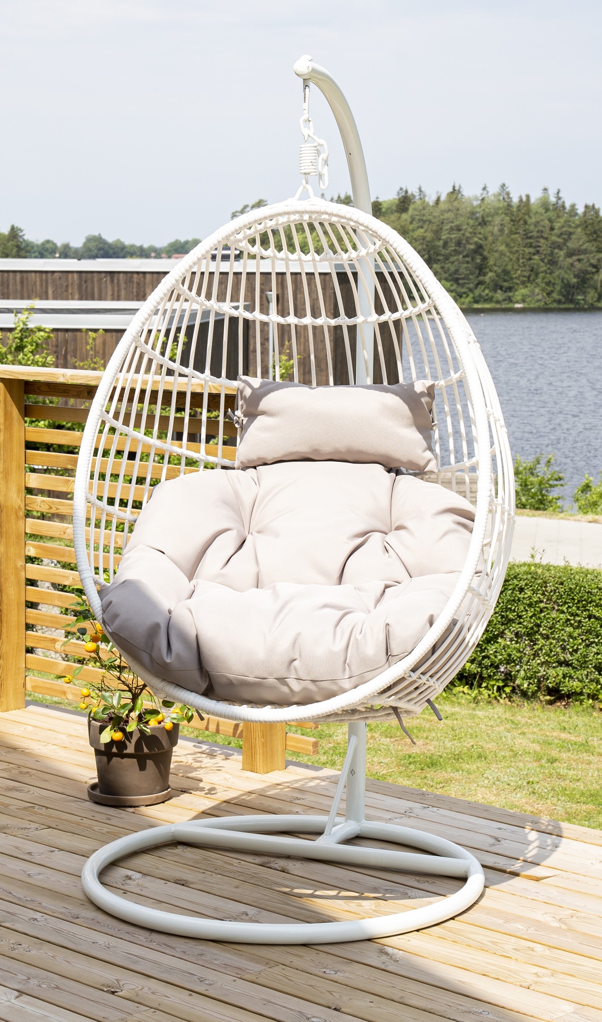 Gör sommarhänget till något alldeles extra i den här läckra hängstolen. Designen är genomtänkt och utformad med ett stativ i vitt stål och konstrotting där grå fluffiga kuddar ingår. Möblera uteplatsen med en riktig designikon som inte bara blir ett blickfång i sommar utan även din nya favoritplats. Konstrotting är ett plastmaterial som passar alldeles utmärkt för vårt skandinaviska klimat. Materialet är UV-beständigt och tåler väder och vind. Stål är ett material som är avvisande mot smuts och vätskor. Däremot behöver man vara uppmärksam på att vatten kan orsaka fläckar och rost. Se därför till att torka av ytan med en en mjuk fuktad trasa och såpvatten, för att undvika att materialet rostar.