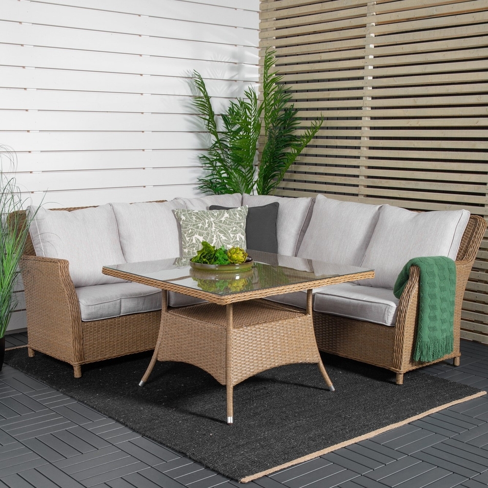 Soffgrupp Vikelund i klassisk design med fokus på en god komfort till din uteplats eller altan. Soffgruppen består av en hörnsoffa med fyra sittplatser och en hörndel. Till soffan tillkommer sandfärgade mjuka dynor samt ett högre soffbord med en avlastningshylla och en stilren bordsskiva av glas. Soffgruppen är tillverkad av en metallstomme och naturfärgad konstrotting - lika praktiskt som tåligt! Skötselråd: Konstrotting är ett plastmaterial som passar alldeles utmärkt för vårt skandinaviska klimat. Materialet är UV-beständigt och tåler väder och vind. Att det är UV-beständigt gör att möblerna inte bleknas, däremot rekommenderar vi alltid att förvara möblerna under ett möbelskydd eller på annat vis torrt och svalt - för att förlänga livslängden.