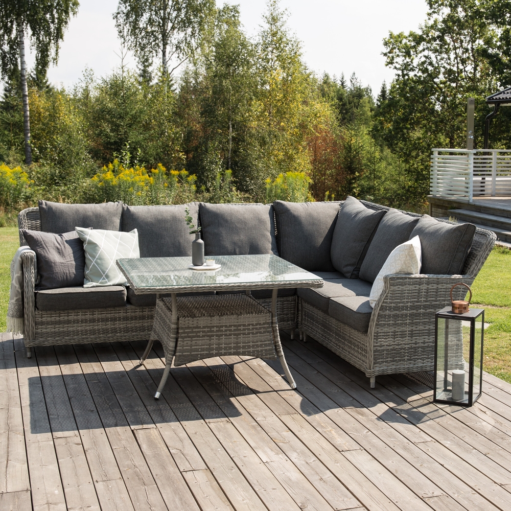 Soffgrupp i klassisk design med fokus på en god komfort till din uteplats eller altan. Soffgruppen består av en hörnsoffa med fyra sittplatser och en hörndel. Ingår gör mörkgrå mjuka dynor samt ett högre soffbord med en avlastningshylla och bordsskiva av glas. Tillverkat av en metallstomme och grå konstrotting.