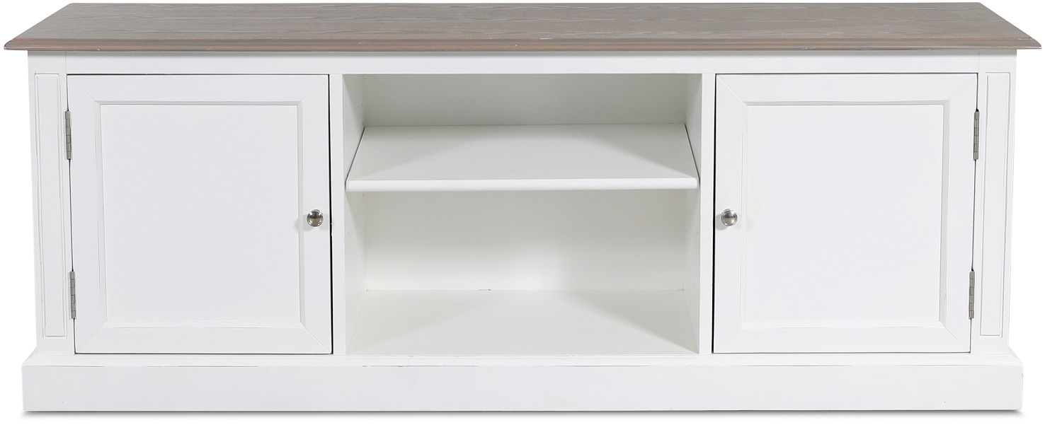 Viktoria tv-bänk i klassiskt utförande. Praktisk förvaring i de två skåpluckorna och justerbara hyllor för mediaspelare. Vit med toppskiva i gräbetsad trä och snyggt fasad kant. uttag på baksidan för sladdragning.