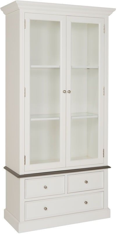 Viktoria är en serie med klassiska möbler med vintage-känsla. Antikvit lack med ett gråbrunt askfanèrad topp. Bra förvaringsmöjligheter då vitrinskåpet är 2 meter högt och 1 meter brett.