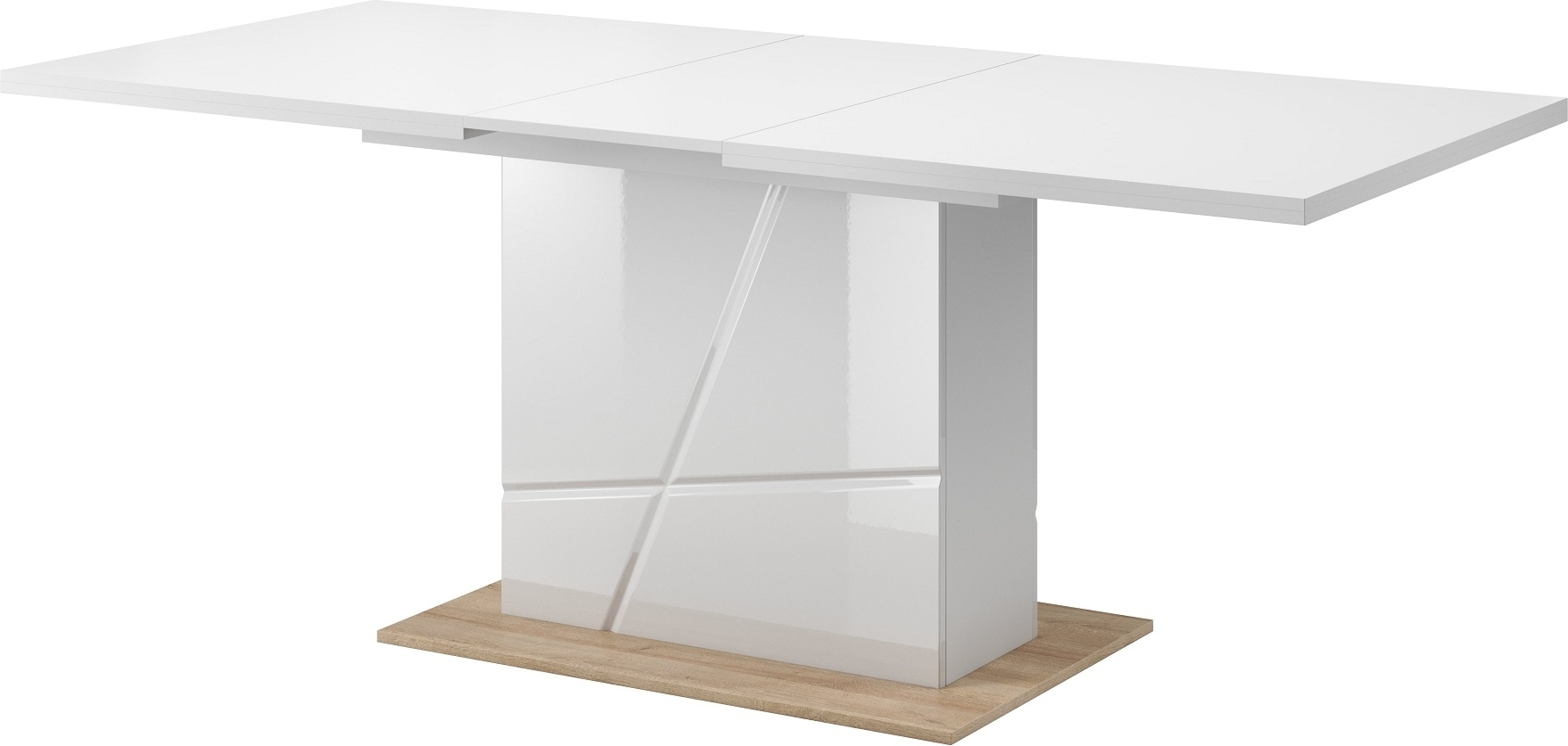 Ett snyggt och modernt designat matbord med högblank vit bas medans bordsskivan är i vitt matt laminat. Bordet är praktiskt då du lätt kan förlänga det från 160 cm till 200 cm.