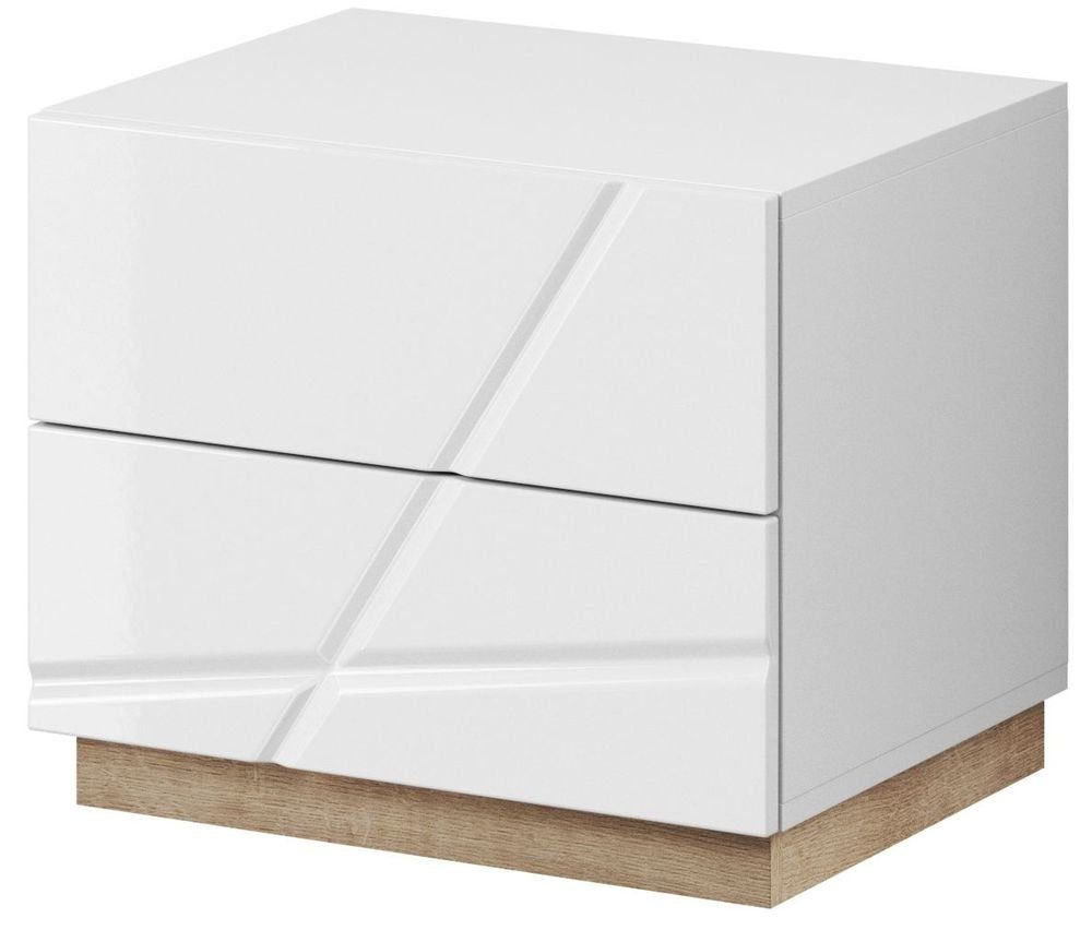 Ett modernt designat sängbord med snygg högblank vit front och gått om förvaringsmöjligheter i form av två lådor med push-open/soft-close funktion.