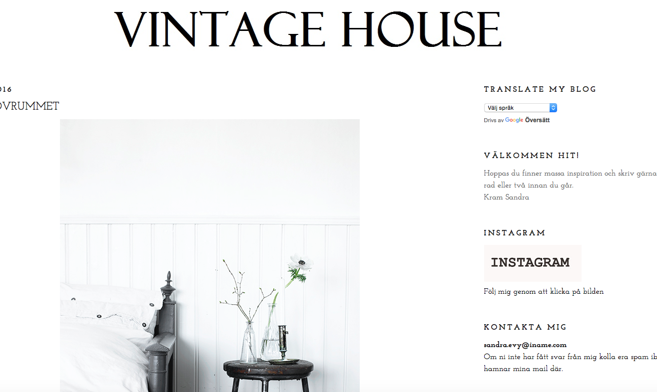 VINTAGE HOUSE är vackra bilder och mycket bilder, många från Sandras eget hem som är inrett i enkel och avskalad vintagemiljö. Sandra gillar inte slit och släng och det är en del av hennes vintagestil att använda de gamla, vackert nötta tingen men i ny miljö. Sina fynd hittar hon på loppisar förstås men också hos goda vänner, allt utplockat för att passa in i Sandras stil. Inspiration hämtas t ex från närbelägna Köpenhamn. Sandra tycker om att göra och fota stilleben så ibland flyttar möblerna runt för att skapa vackra bilder. Vi gillar speciellt det egensinnigt målade altangolvet i gön/vit rutigt som dyker upp på en av dessa bilder. Men det slinker också in bilder på en stor härlig korg med hembakta bullar när det är kanelbullens dag bilderna och på kärleksmumsbaket de sistnämnda gör att man omedelbart vill baka själv.