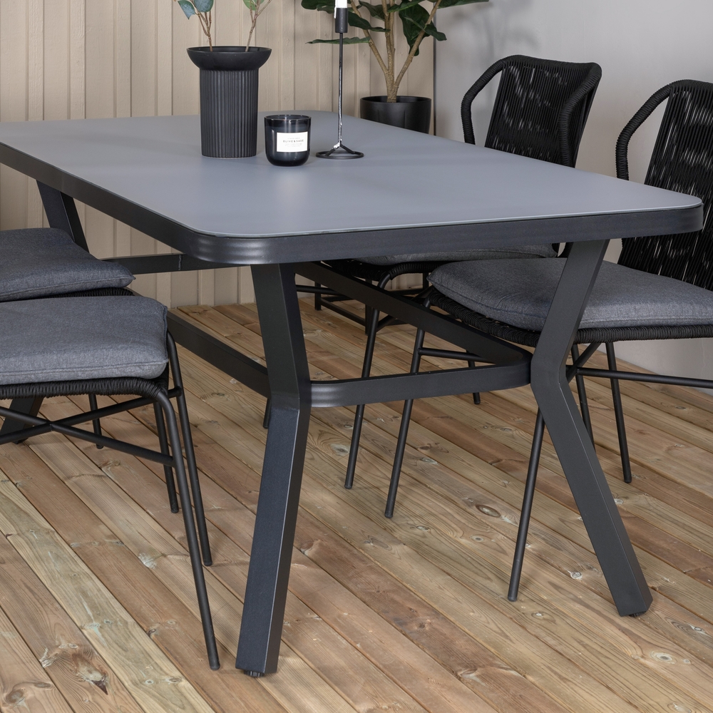 Virya är ett läckert matbord med en bordsskiva i glas och bordsben i svart aluminium. Med dess hållbara material och stilrena uttryck passar matbordet lika bra ute på altanen som ute i trädgården. Bjud in vänner och familj - och njut av sommaren på allra bästa sätt! Skötselråd: Utemöbler i aluminium och rostfritt stål bör rengöras regelbundet med vatten och mild tvål. Skölj alltid noggrant med rikligt med vatten, något som blir extra viktigt om möblerna är placerade på ett havsnära avstånd där salt kan transporteras via luften.