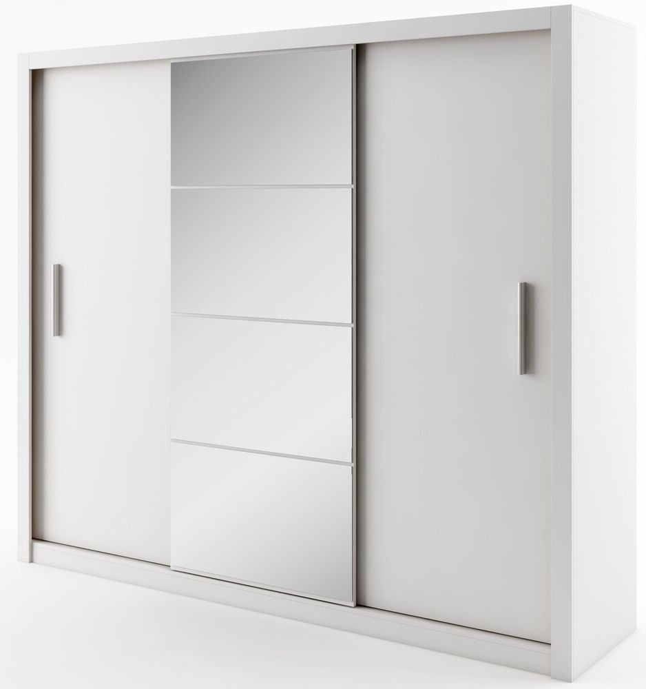 En snygg och mycket rymlig garderob med en modern design. Tillverkad i Chipboard och med många förvaringsmöjligheter. Bakom de tre skjutdörrarna med spegelglas, finner du massa med utrymme, klädstång och hyllplan. Handtag av plast med matt finish. Levereras omonterad.