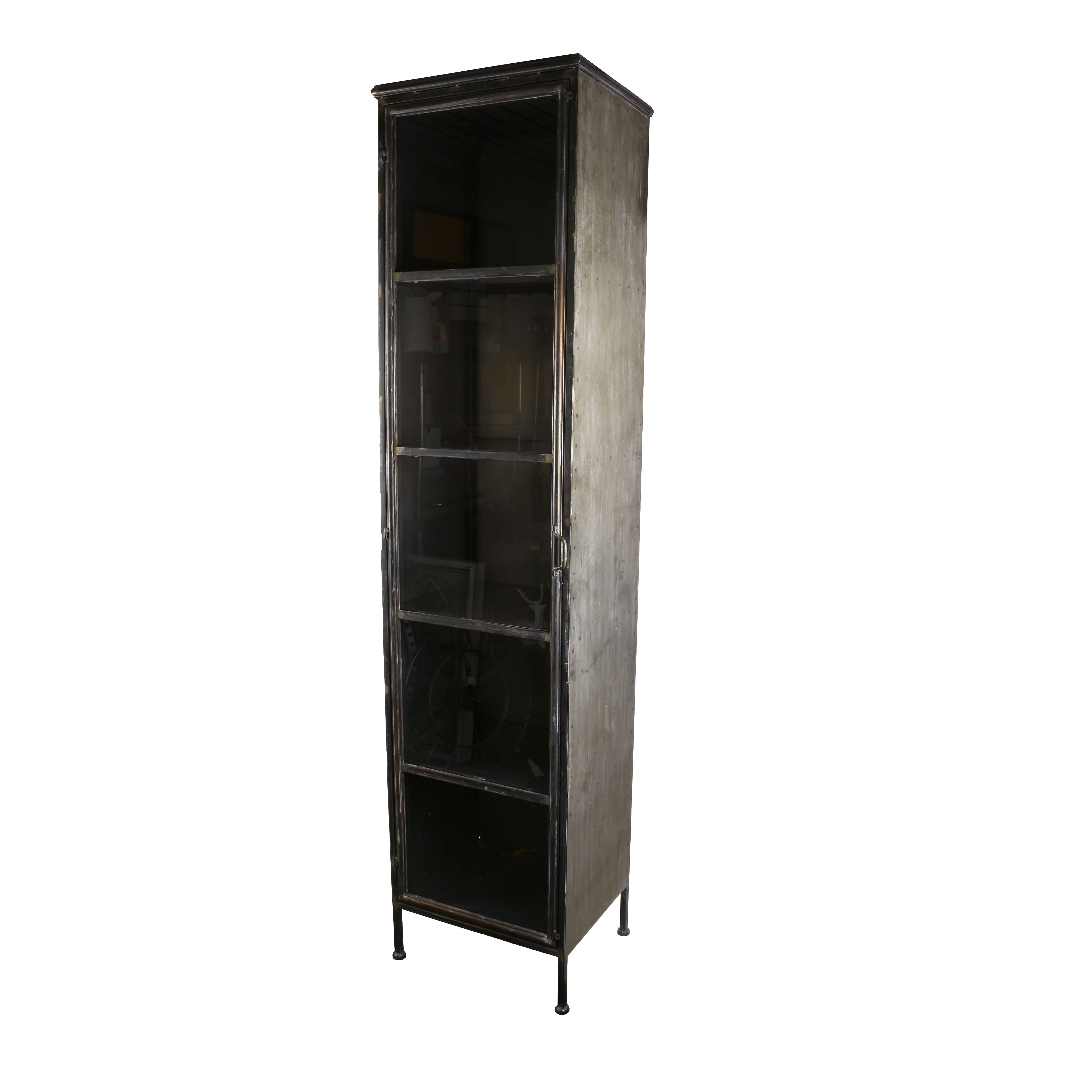 Smalt och högt vitrinskåp i svartgrå metall. Passar bra för dig som inte har så mycket plats men vill ha lite extra förvaring.