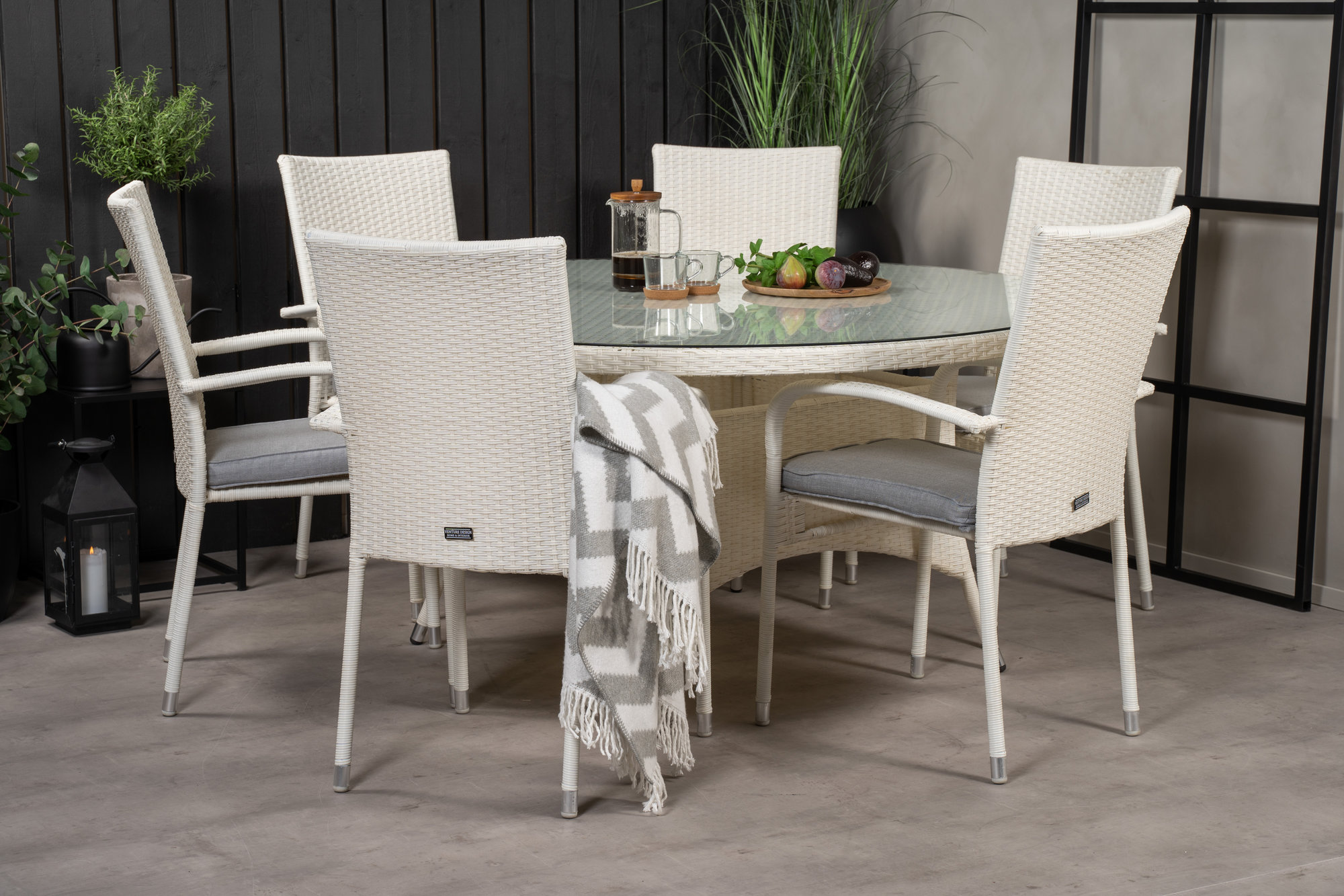 Matbordet Volta i kombination med de stapelbara matstolarna Anna i vit konstrotting erbjuder en stilren och tålig matgrupp som passar perfekt för härliga middagar. Den runda designen skapar en inbjudande atmosfär och är ett utmärkt val för en trivsam uteplats.