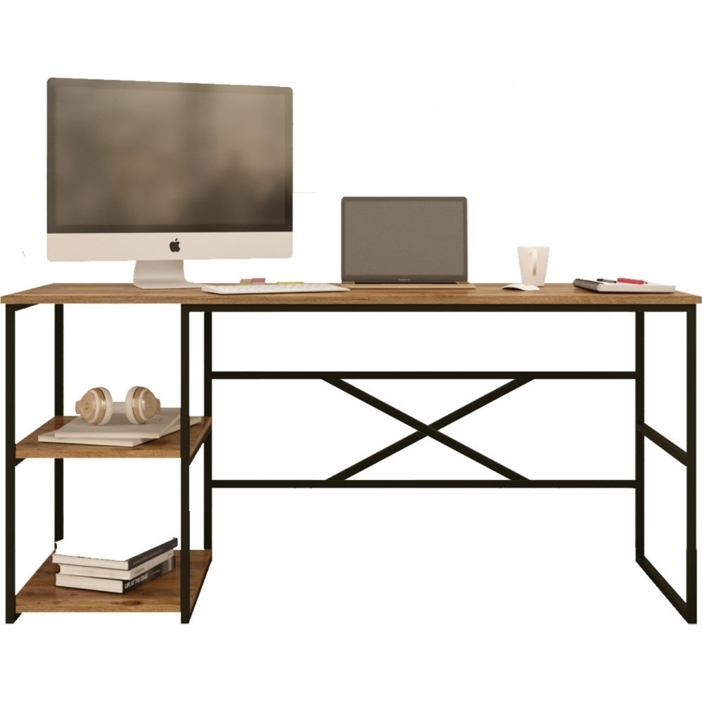 Skrivbord av trä och metall.
