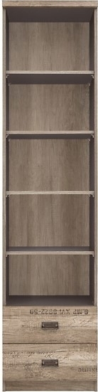 En smal bokhylla i ek med många hyllplan och två lådor undertill för mindre förvaring. Eftersom bokhyllan är smal men hög tar den inte så mycket plats och är lättplacerad. Som en fin detalj finns det diskreta grafiska ord och siffror på möblerna som en röd tråd genom hela möbelserien
