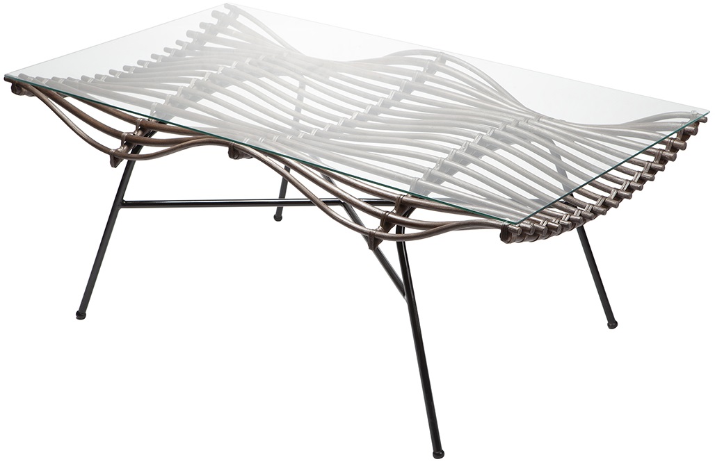 Ett häftigt soffbord med en härlig naturlig design. Bordet är tillverkat i rotting med svarta metallben och en glasskiva.