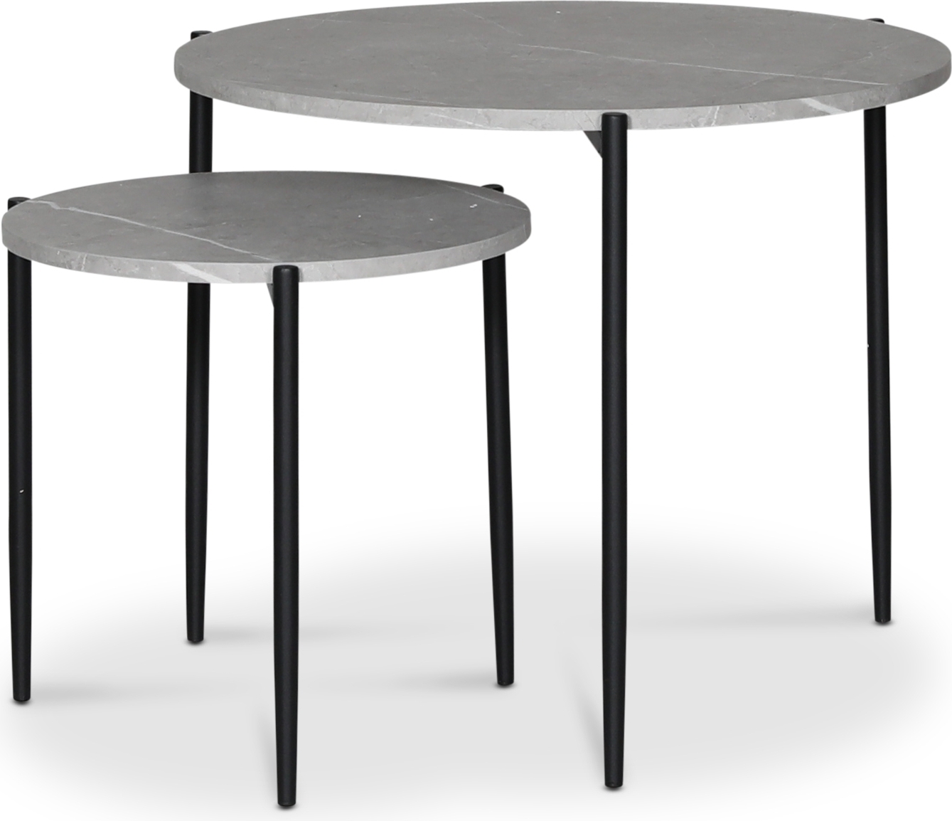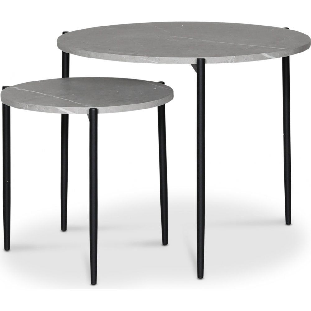 Wayne möbelserie är en prisvärd serie med finnes på utförande och designen. Satsbord med toppskivor i tålig ljusgrå marmorfoliering med svart metallunderrede.