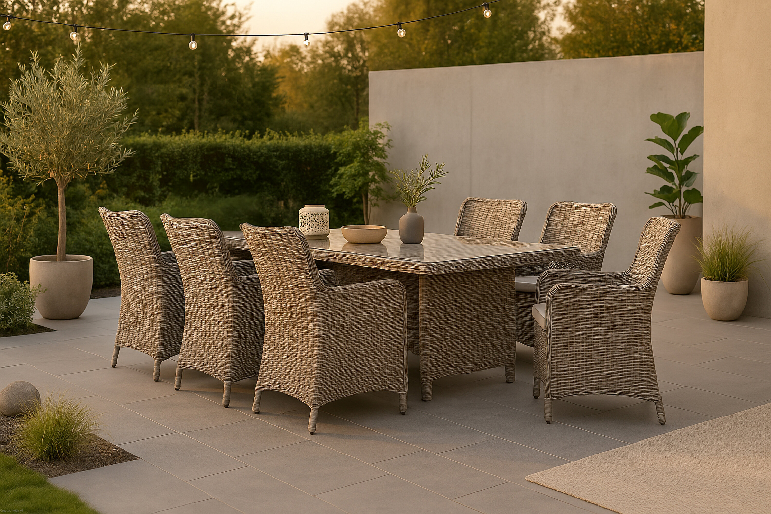 En bekväm matgrupp med alla rätt; slitstark, stilren och praktisk för alla tillfällen! Den här matgruppen från serien Wembley inkluderar ett matbord i konstrotting med en bordsskiva i glas och sex stycken bekväma fåtöljer. Genomgående i en jordnära beige kulör. Möblera uterummet eller trädgården inbjudande och bekvämt i sommar!