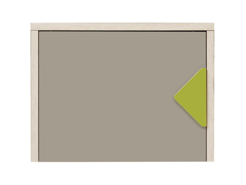 Nätt vägghängt skåp i ekimitation/beige med pilformat grönt handtag. Passar bra in i barnrummet.