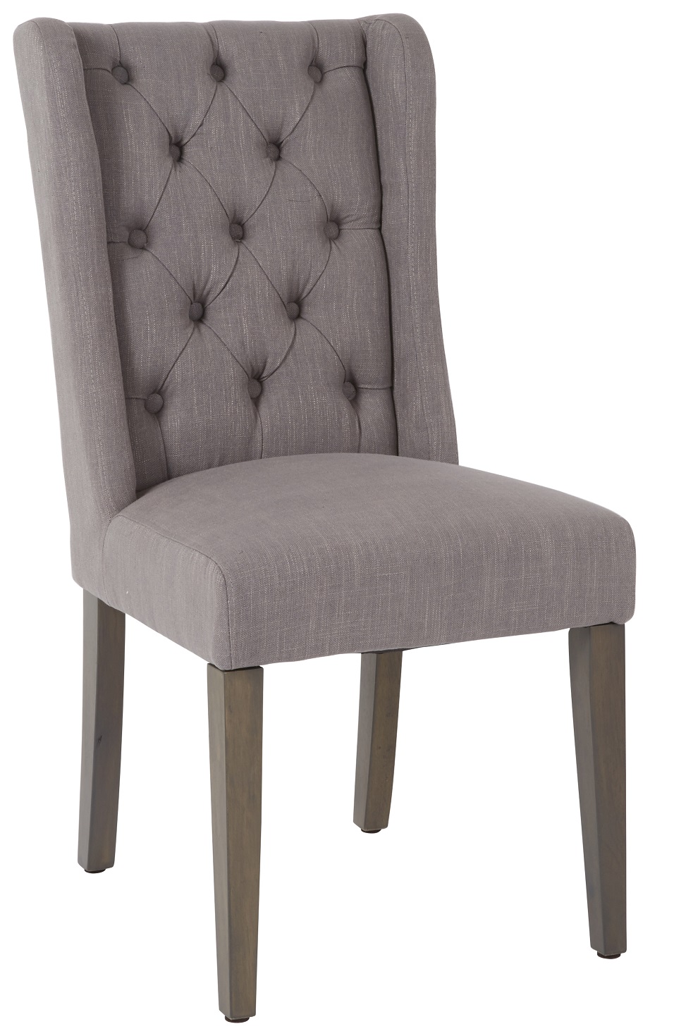 William stol i grått tyg med skön komfort. Välarbetad rygg med djuphäftade knappar. En gedigen stol med en tilltalande design som passar i både modern som lantlig stil. Bruna ben.