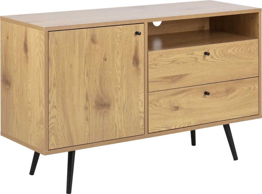 Skänk tillverkad i melamin med ek-imitation. Ett skåp och två lådor, samt ett hyllplan med förborrat sladdhål för smart förvaring. Underredet är tillverkat av svart pulverlackerad metall.