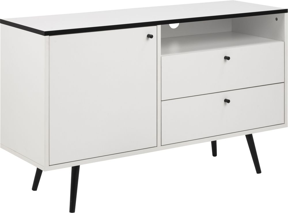 Skänk tillverkad i vit melamin med svarta kanter. Ett skåp och två lådor, samt ett hyllplan med förborrat sladdhål för smart förvaring. Underredet är tillverkat av svart pulverlackerad metall.