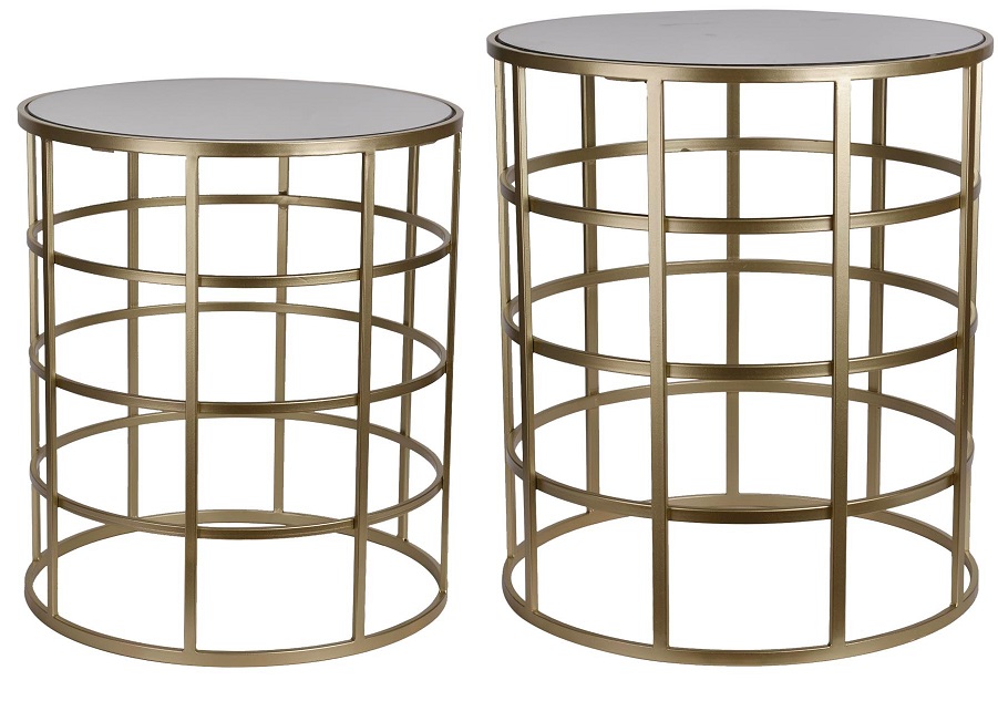 Winton satsbord bestående av ett lite högre satsbord samt ett lägre satsbord. Satsbordet är i matt guldlack med glasskiva som topp.