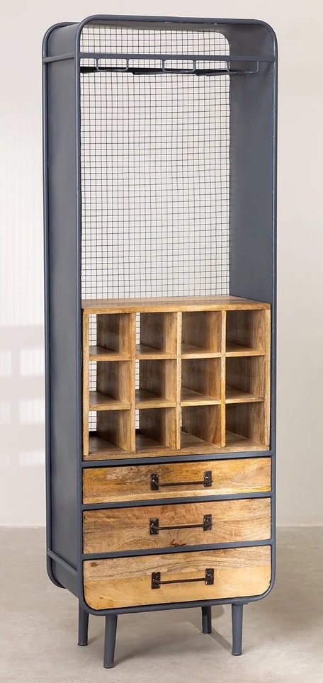 WoodCraft är en serie av välproducerade vintagemöbler i mango och metall med rätt känsla. Barhylla med hängare för vinglas och inbyggt vinställ. Tre förvaringslådor.