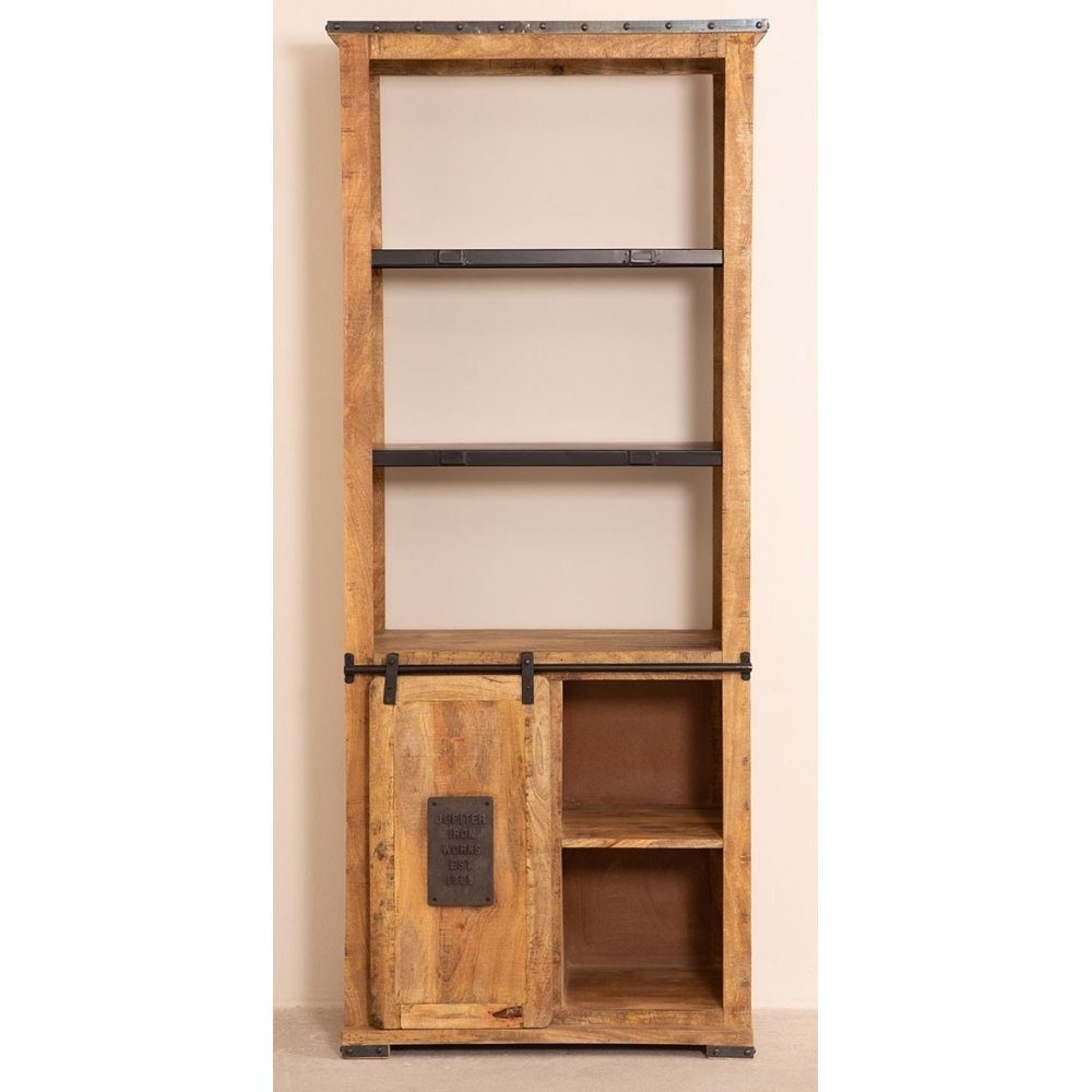 WoodCraft är en serie av välproducerade vintagemöbler i mango och metall med rätt känsla. Bokhylla med tre öppna plan och skåp med skjutdörr på skena.