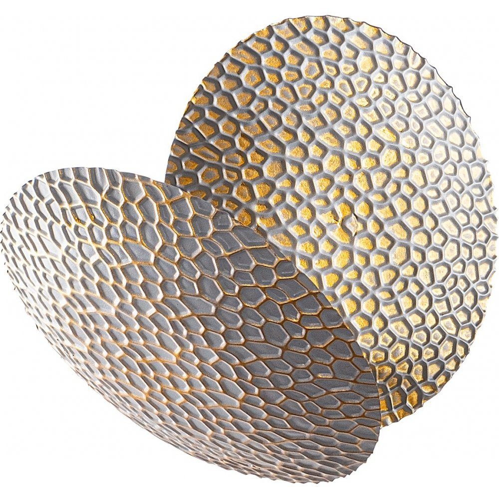 Vägglampa av metall som pulverlackerats guld och silverfärgad. Ljuskällan består av integrerad, ytmonterad LED-belysning som lyser med ett varmvitt ljus (3000 K).