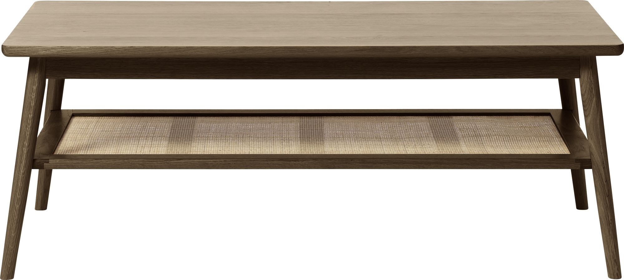 Yuma soffbord i rökfärgad ek med hylla i rotting.