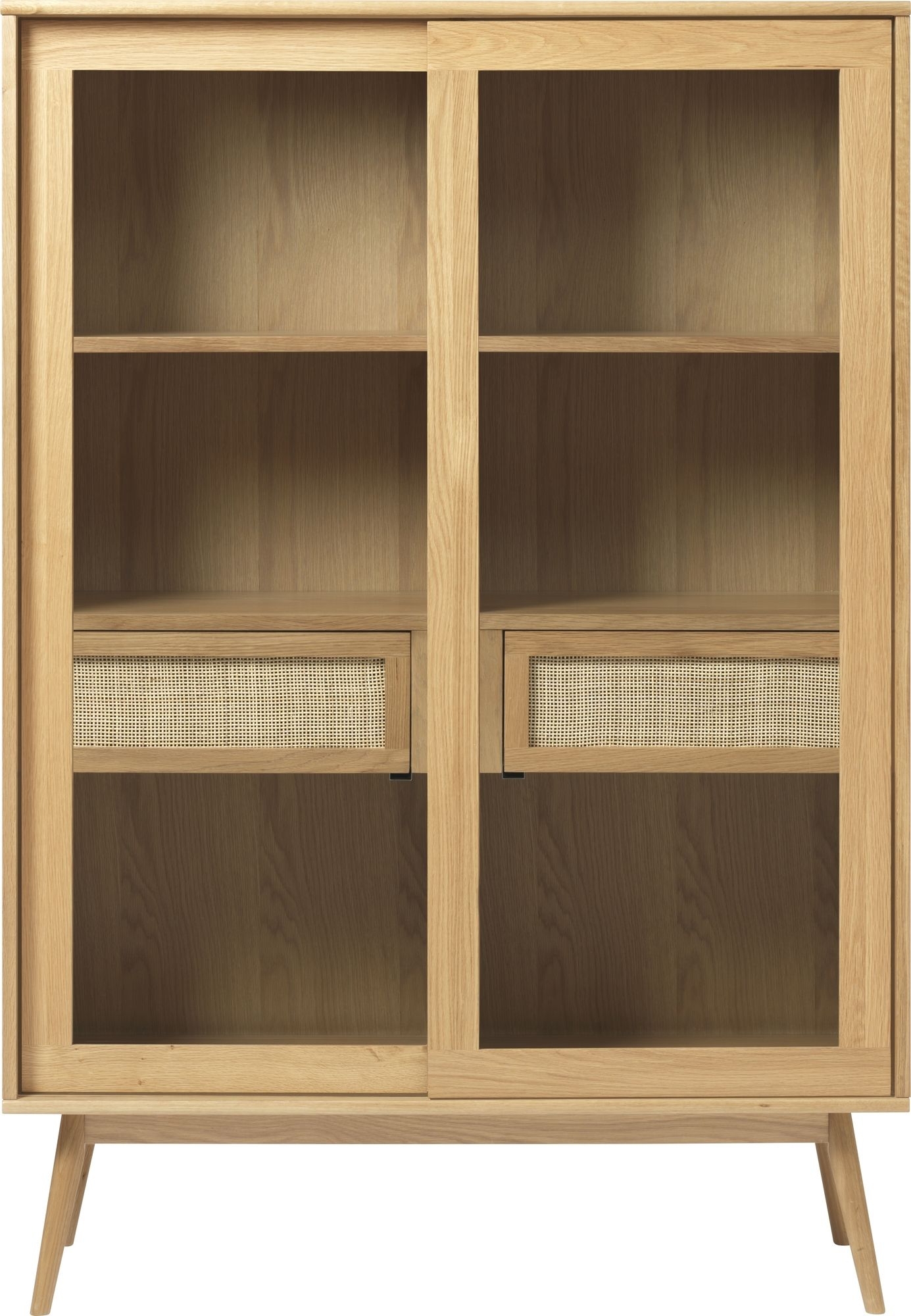 Yuma vitrinskåp i oljad ek med rotting. Skåpet innehåller även två stycken förvaringslådor. Skjutdörrar och justerbara hyllplan.