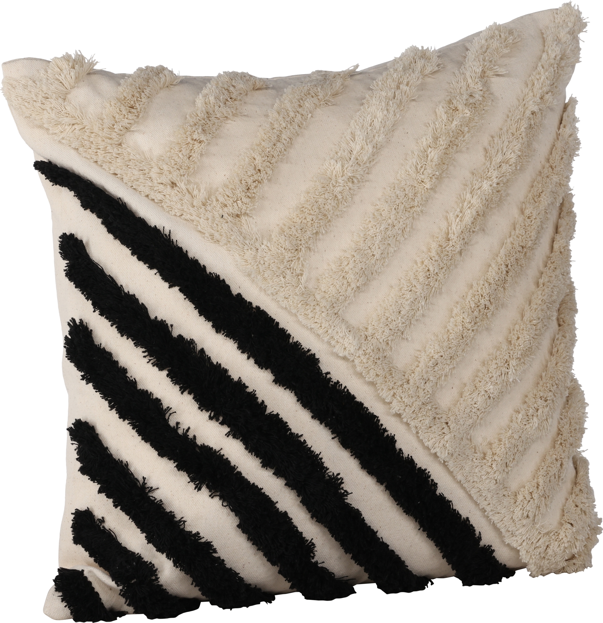 Det här kuddfodralet är både modernt och slitstarkt i poly-bomullsblandning med ett tuftat mönster som ger både liv och struktur till kudden. Färgbasen är i gräddig beige kulör och hälften av det abstrakta, linjära mönstret är i svart. Matcha och variera med andra kuddfodral runt omkring och låt det här stå i centrum.