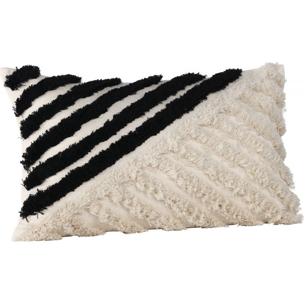 Det här kuddfodralet är både modernt och slitstarkt i poly-bomullsblandning med ett tuftat mönster som ger både liv och struktur till kudden. Färgbasen är i gräddig beige kulör och hälften av det abstrakta, linjära mönstret är i svart. Matcha och variera med andra kuddfodral runt omkring och låt det här stå i centrum.
