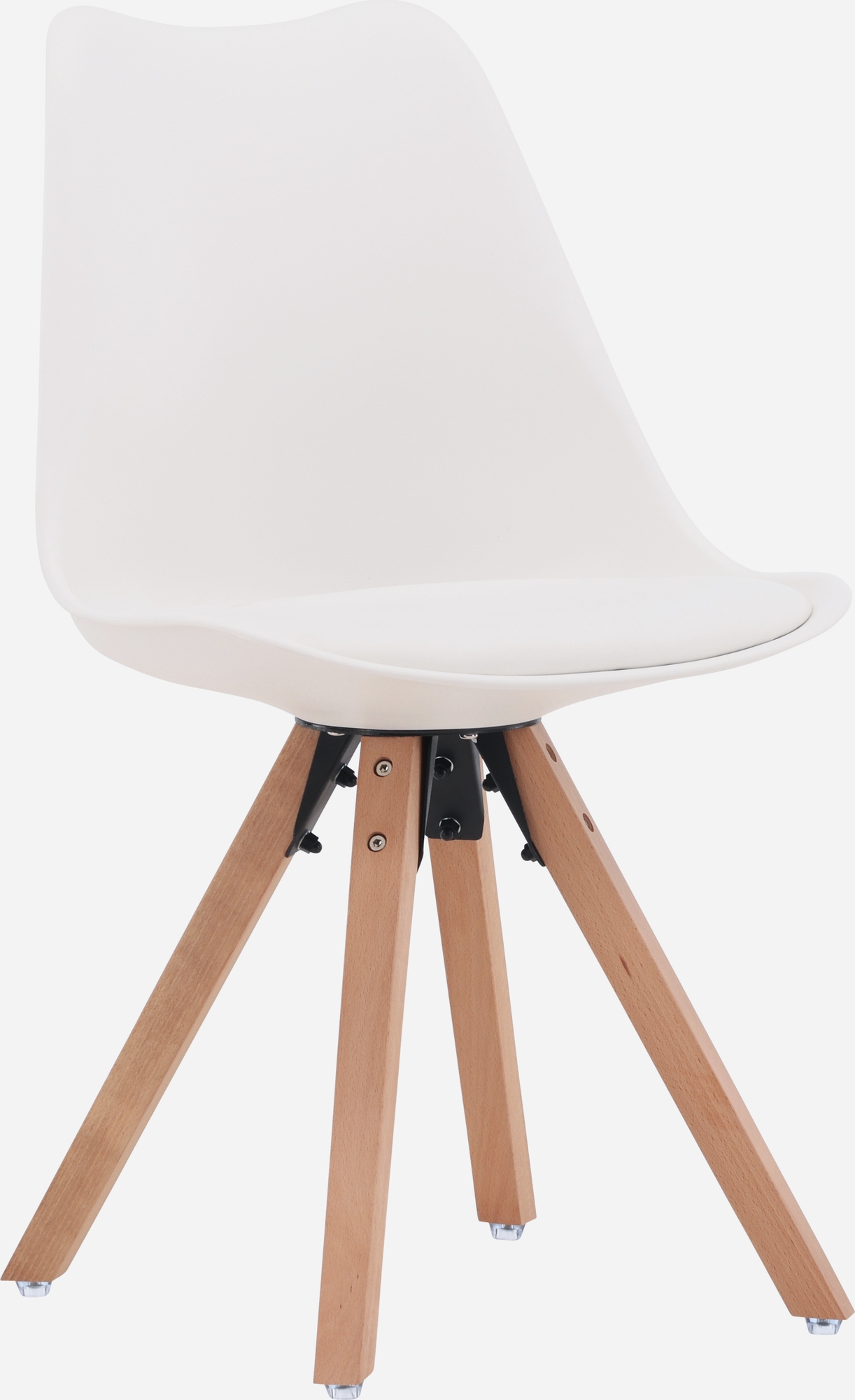 Matstol i tuff helklädd design med ben i trä. Den här stolen har en inbjudande utformning med rygg och sits i vit plast och inbyggd sittdyna med hög komfort. Matcha med ett snyggt matbord och skapa en trivsam mittpunkt i ditt hem. Här sitter du bekvämt och njuter av goda måltider framöver!